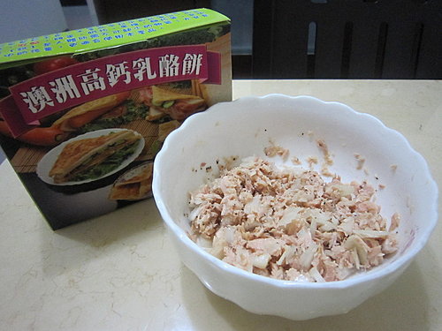 小孟欣有先把鮪魚加工.加了洋蔥丁跟黑胡椒攪拌