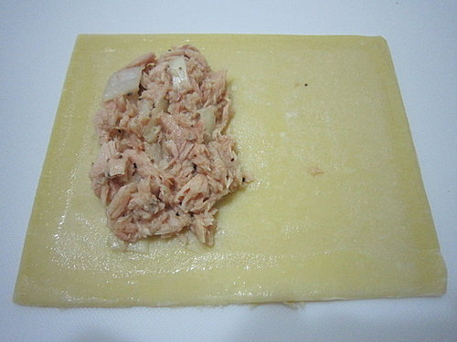 在起酥片四周塗上蛋液.將鮪魚餡放在其中一邊